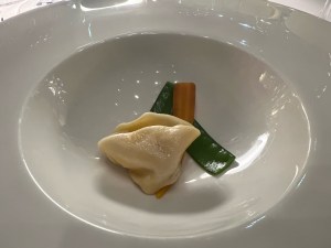 Dopo l’antipastino triste, vale a dire un pezzo di sgombro infilato come una bandierina su delle fette di mele (NB: ai vegetariani hanno propinato lo stesso piatto, ma senza sgombro) arriva, come primo piatto, un unico, desolato e triste raviolo.