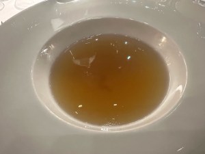 Dopo 10 minuti, sorpresa, il cameriere porta del consommé, e la cosa si intorbidisce ulteriormente: il raviolo non era stand-alone, ma andavo affogato!